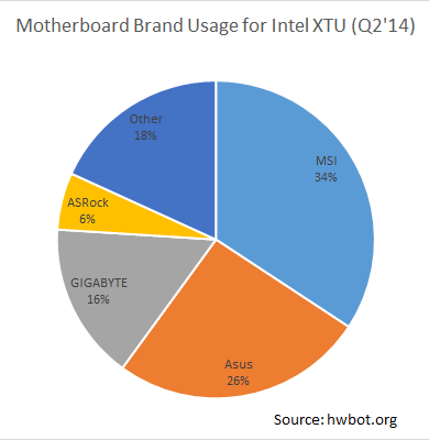Looking at the brand usage figures in 2014, we see that MSI is leading with 34%. ASUS powers 26% of the systems and GIGABYTE 16%. It's great to see MSI leading so much new blood to the world of overclocking!