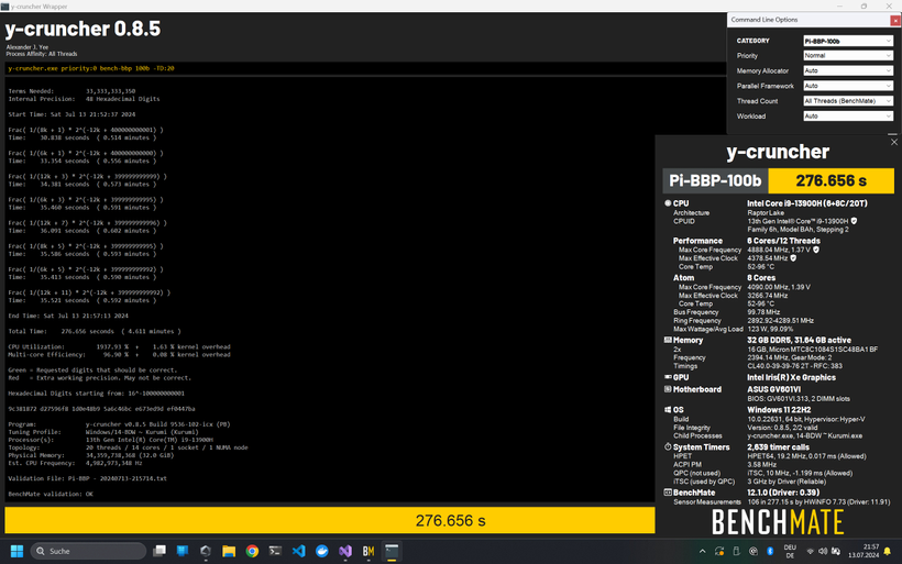 The y-cruncher integration was also rewritten to be more robust and more secure. Each result is now checked against y-cruncher's own validation file to detect if the result is 100% valid. BenchMate now also supports y-cruncher version 0.8.3 and 0.8.4.