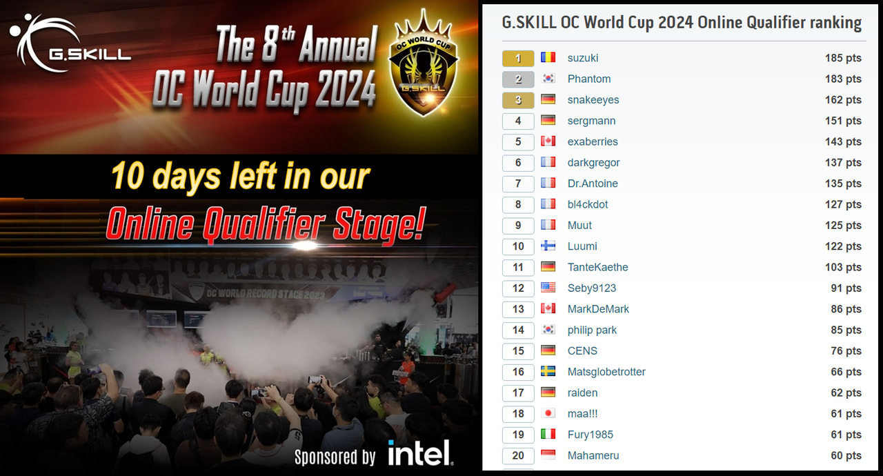 The Online Qualifier stage will be hosted on hwbot.org between March 1, 2023 and April 5, 2023. This stage is open to all overclockers worldwide, and participants must use G.SKILL memory kits and designated Intel platforms to submit results across 4 overclock categories that tests each overclocker's skills: Highest Memory Frequency, Cinebench R15, Y-Cruncher – Pi-2.5b, and SuperPi 32M. For more event details and rules, as well as to participate in the Online Qualifier stage of the OC World Cup 2023.