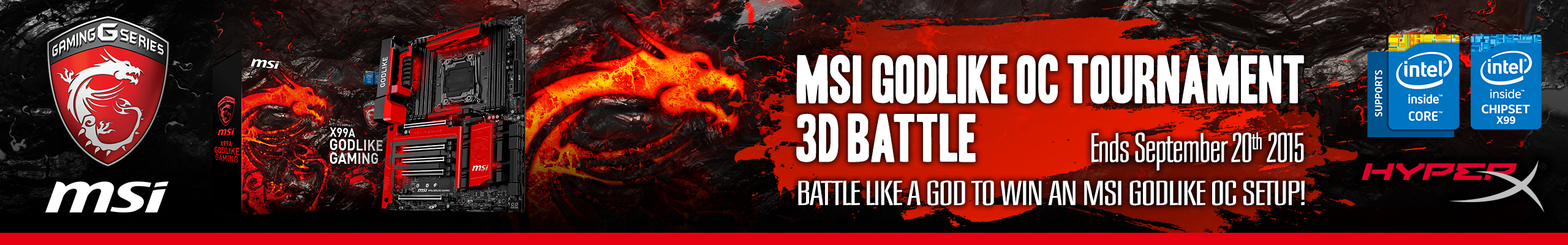 The MSI GODLIKE OC Tournament in partnership with Intel and HyperX gives a chance to all MSI users to Battle like a God and win an incredible MSI GODLIKE OC Setup, including the latest MSI X99A GODLIKE GAMING, Intel Core i7, and HyperX gear!