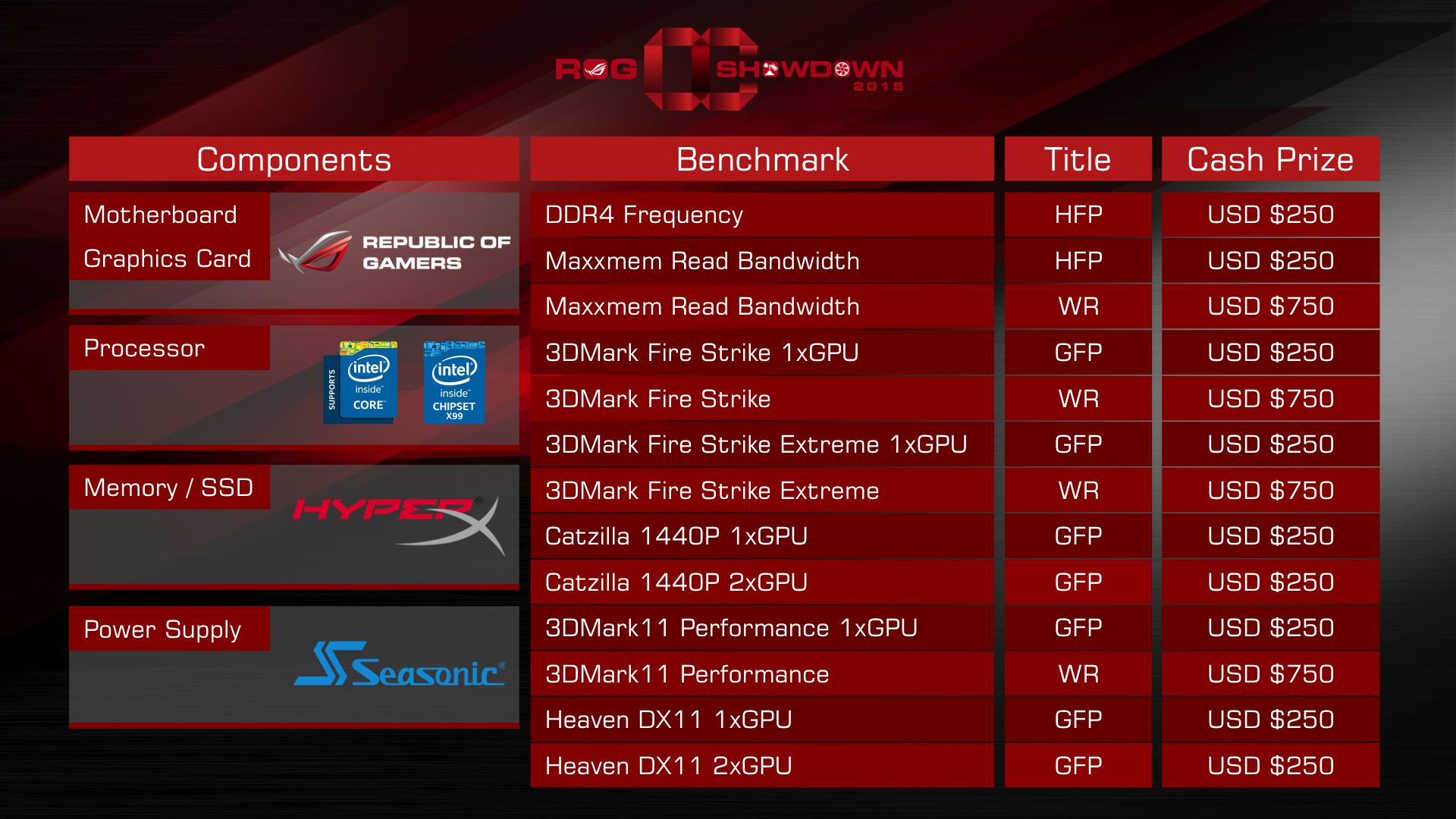 ASUS ROG and partners supplies the participants who lack some gear the hardware on loan to compete for the prizes. In total there are 13 targets: 4x WR, 7x GFP, and 2x HFP. The cash prize is awarded to the overclocker who holds the World Record, Global First Place, or Hardware First Place at the end of the competition. The cash prize awarded for a World Record is USD $750 and for a Global or Hardware First Place USD $250.
